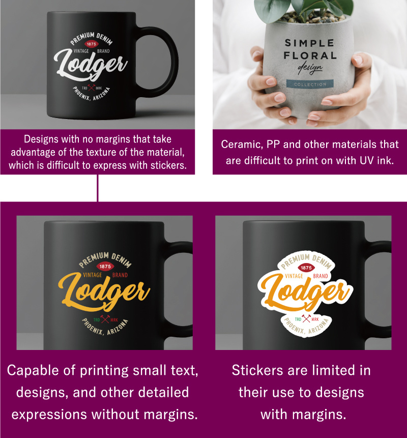 Since only the design printed on the film is transferred to the object, UV-DTF requires no shavings removal manually as with sticker sheets. Also, since the design is not printed directly on the material, the risk of misprinting is low due to misalignment of the material setting position, so that expensive items can be decorated with confidence. This is a convenient printing method that expands the range of custom-made goods production.