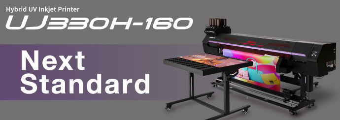 "UJ330H-160" is a Hybrid UV inkjet printer that supports direct printing of rigid (board) materials in addition to output to roll materials.