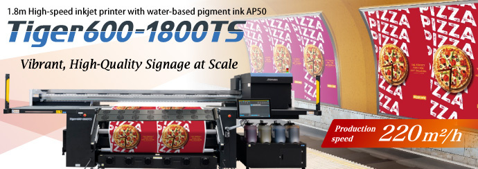 The Tiger600-1800TS equipped with the "AP50" delivers vivid, high-quality advertising output at high speeds with stable performance. Its practical speed of 220 sqm/h (2,368 sqft/h) offers high productivity, while its transport system minimizes media wrinkling. It enables the stable mass production of eye-catching, vibrant graphics for urban settings.